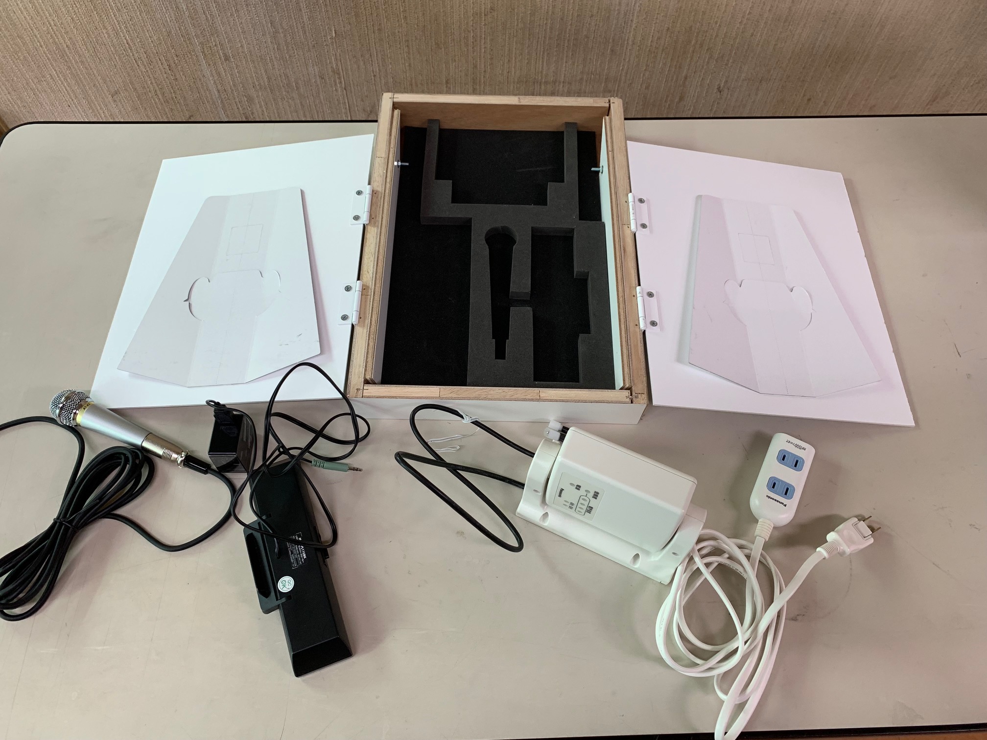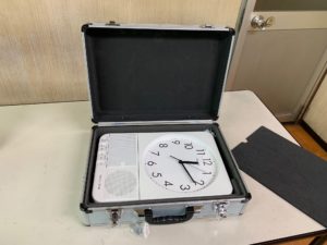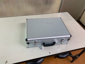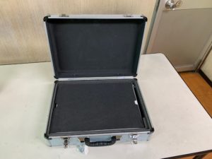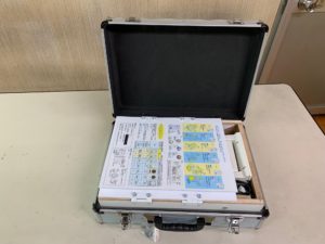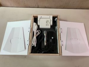 展示ボードの裏側に周辺機器を収納し既製のケースに収めました。