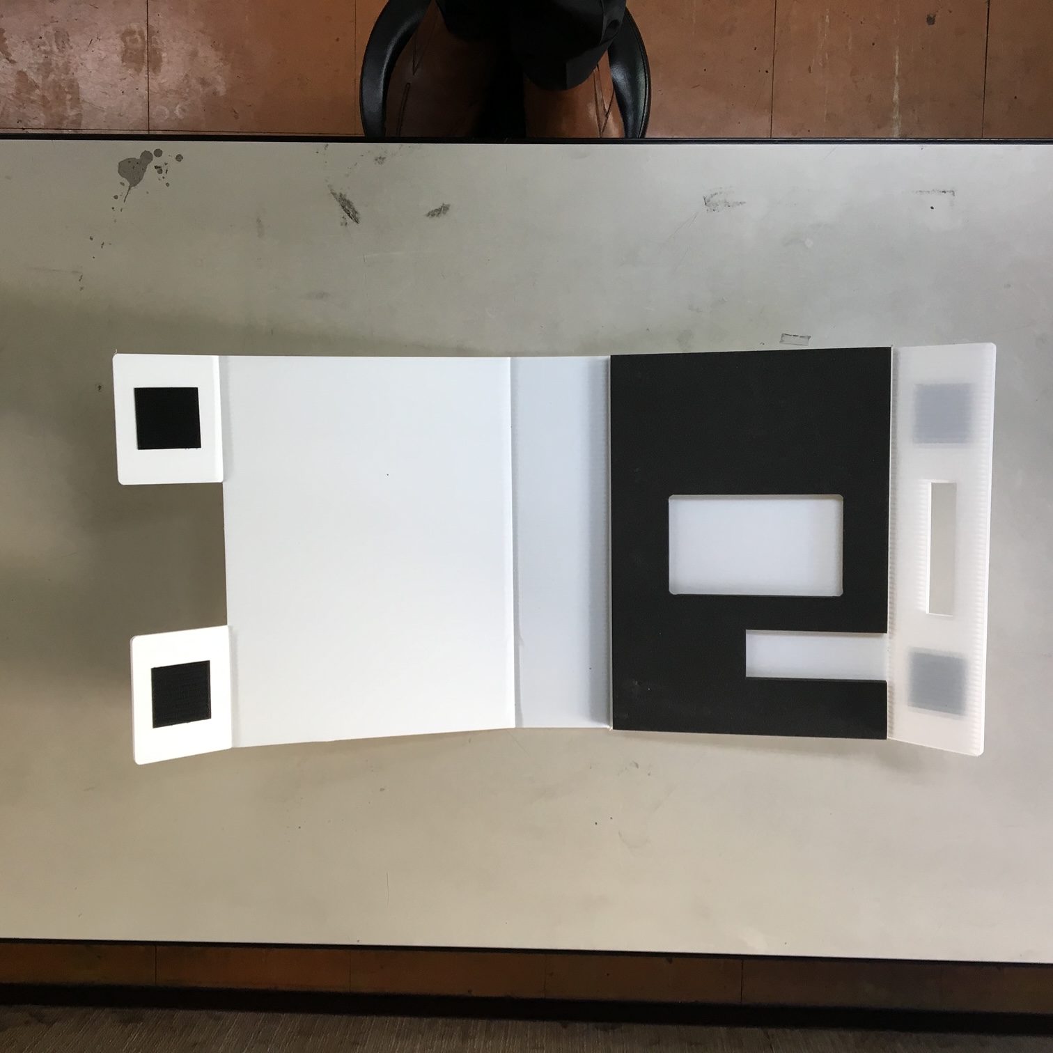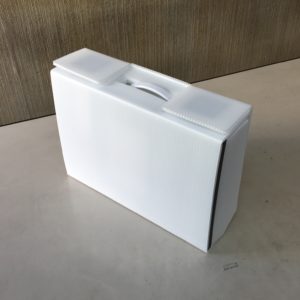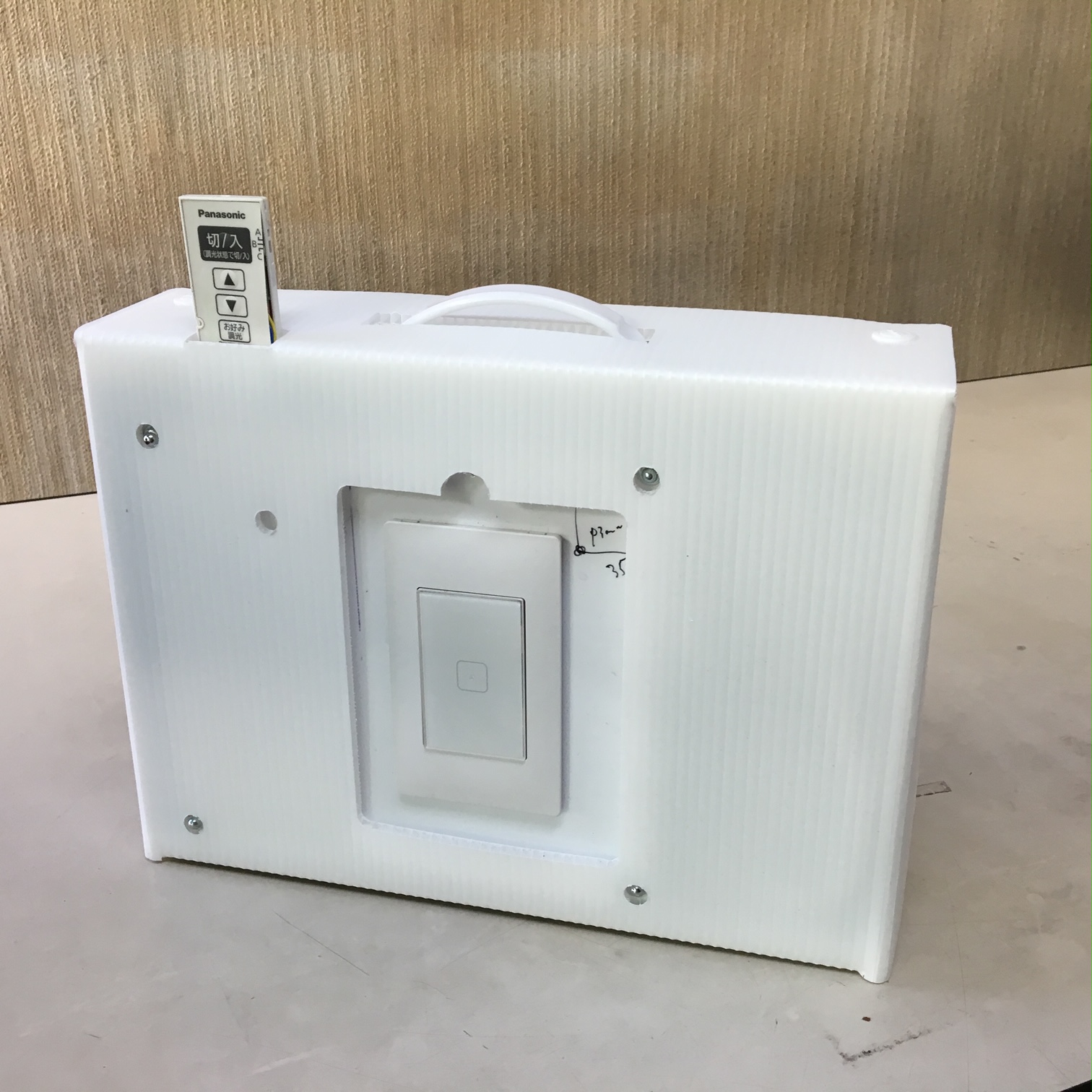 サイドからプラダンを巻き、下からフタをし、ベルトをかける構造に設計しました。