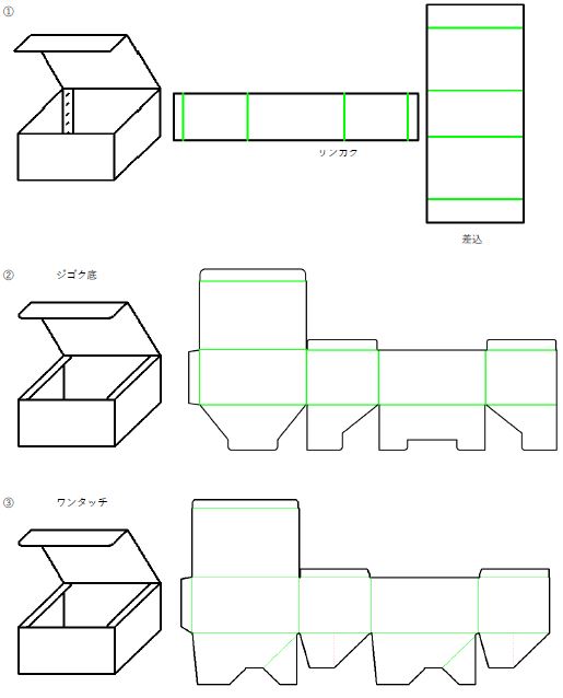 ②はジゴク底と呼ばれる組底タイプ、③は底にも貼りを入れたワンタッチタイプです。